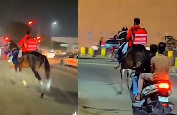 ചഞ്ചല്ഗുഡയില് ഇംപീരിയല് ഹോട്ടലിന് തൊട്ടടുത്താണ് ഇയാള് യാത്രചെയ്യുന്നത്. സൊമാറ്റോ ബാഗുമായി ഡെലിവറി ഏജന്റ് കുതിരപ്പുറത്ത് മറ്റ് വാഹനള്ക്കൊപ്പം റോഡിലൂടെ പോകുന്നതാണ് വീഡിയോയില് കാണുന്നത്. റോഡിലെത്തിയപ്പോള് പൊതുജനങ്ങള്ക്ക് നേരെ കൈ പൊക്കി കാണിക്കുന്നതും കാണാം.