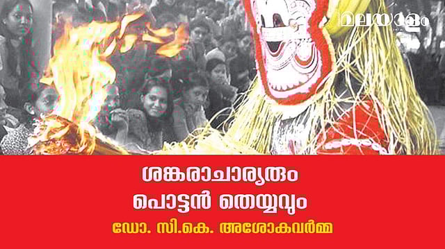 കോലത്തുനാട്ടിലെ കാവുകളില്‍ കെട്ടിയാടിക്കപ്പെടുന്ന തെയ്യക്കോലങ്ങളില്‍ ഏറ്റവും പ്രചാരണമാര്‍ന്ന പൊട്ടന്‍ തെയ്യത്തിന്റെ തോറ്റത്തിലെ വരികള്‍ സൂചിപ്പിക്കുന്നത് 'മനീഷാപഞ്ചക'ത്തിലെ പ്രാരംഭ ശ്ലോകങ്ങളിലെ അദ്വൈതാശയം തന്നെയാണ്. പശ്ചാത്തല പുരാവൃത്തത്തില്‍ ചെറിയൊരു മാറ്റമുണ്ട്. ജഗദ്ഗുരു സര്‍വ്വജ്ഞപീഠത്തിലേക്കടുക്കുമ്പോള്‍ ശിവന്‍ പുലപ്പൊട്ടനായി ആചാര്യന്റെ അറിവ് പരീക്ഷിക്കാനെത്തുന്നു. പാര്‍വ്വതി പുലച്ചാമുണ്ഡിയായും നന്ദികേശന്‍ പുലമരുതനായും (പൊലാരന്‍) ഒപ്പം ചേരുന്നു. പുലയനെ തീണ്ടി ശുദ്ധം മാറാതിരിക്കാന്‍ ശങ്കരന്‍ അവരോട് മാറിനില്‍ക്കാന്‍ പറയുമ്പോള്‍ പൊട്ടന്‍ തെയ്യം പറയുന്ന വാക്കുകള്‍ അന്ന് (ഇന്നും) ഉള്ള സാമൂഹിക സമത്വത്തിനെ പരിഹാസത്തോടെ തുറന്നുകാട്ടുന്ന നിശിതവിമര്‍ശനമാണ്. ജാതീയതയുടേയും വര്‍ഗ്ഗീയതയുടേയും നേര്‍ക്ക് ഇളിച്ചുകാട്ടുന്ന ഇമോജിയായാണ് പൊട്ടന്‍ തെയ്യത്തിന്റെ സ്ഥായീഭാവം. മനുഷ്യരെല്ലാം ഒരു ചരടിലിണക്കിക്കോര്‍ത്ത പുഷ്പങ്ങളാണ് എന്ന തത്ത്വവും ജാതി, മത, വര്‍ഗ്ഗ, വര്‍ണ്ണചിന്തകള്‍ക്കതീതമാണ് സത്യമെന്ന ബോധവും ഉയര്‍ത്തിക്കാട്ടുന്നതാണ് തെയ്യത്തിന്റെ തോറ്റം (തെയ്യം കെട്ടിയാടുമ്പോള്‍ അതിനോടനുബന്ധിച്ച് പിന്നണിയില്‍ പാടുന്ന അനുഷ്ഠാനപ്പാട്ടാണ് തോറ്റം). ചടുലചലനങ്ങള്‍കൊണ്ട് സജീവവും, സാഹസികാഭ്യാസങ്ങള്‍കൊണ്ട് ഉദ്വേഗജനകവുമാണ് പൊട്ടന്‍ തെയ്യത്തിന്റെ പ്രകടനം. തീയിലേക്ക് സ്വയം എടുത്തെറിയുന്ന തെയ്യം പറയുക 'എനിക്ക് കുളിരുന്നേ' എന്ന വ്യാജോക്തിയാണ്. വികടത്തം നിറഞ്ഞ വിളയാട്ടങ്ങളും കുസൃതിത്തം മുറ്റിയ തമാശകളും ആക്ഷേപഹാസ്യ പ്രയോഗങ്ങളും പൊട്ടന്‍ തെയ്യത്തിന്റെ മുഖമുദ്രകളാണ്. അതേസമയം കാണികളോട് മറയില്ലാതെ ചേര്‍ന്നുനിന്ന് അവരെ ചിരിപ്പിക്കുന്ന പൊട്ടന്‍ തെയ്യമാണ് അദ്വൈതാശയത്തിന്റെ വക്താവായി മാറുന്നതെന്നത് വിരോധാഭാസം. വിവരമുണ്ടെന്നു നടിക്കുന്നവരെ കുഴക്കുന്ന ചോദ്യങ്ങള്‍കൊണ്ട് വശംകെടുത്തുന്നവര്‍ 'പൊട്ടന്‍' എന്ന് മുദ്രകുത്തപ്പെടാറുണ്ട്. അതാവാം ഈ ദൈവം ആ പേരില്‍ അറിയപ്പെടുന്നത്. അല്ലെങ്കില്‍ കാര്യം പറയുമ്പോഴും രസിപ്പിക്കാന്‍ ഉദ്യമിച്ച് മൂഢനെപ്പോലെ അഭിനയിക്കുന്നതുകൊണ്ടാവാം.