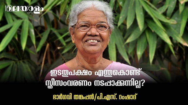 നിയമനിര്‍മ്മാണസഭകളിലെ സ്ത്രീ സംവരണം ഇതുവരെ യാഥാര്‍ത്ഥ്യമാകുന്നില്ല എന്നതു വസ്തുതയാണെങ്കിലും പക്ഷേ, അതാതു പാര്‍ട്ടികള്‍ക്ക് സ്വന്തം സ്ഥാനാര്‍ത്ഥി നിര്‍ണ്ണയത്തില്‍ സ്ത്രീസംവരണം നടപ്പാക്കാമല്ലോ എന്ന അതിപ്രധാന അഭിപ്രായം ഭാര്‍ഗവി തങ്കപ്പന്‍ മുന്നോട്ടു വയ്ക്കുന്നു. 'ഞങ്ങളിത് ഞങ്ങളുടെ പാര്‍ട്ടി വേദികളില്‍ പറയാറുണ്ട്. പാര്‍ലമെന്റ് പാസ്സാക്കിയില്ലെങ്കിലും നമ്മുടെ പാര്‍ട്ടിക്കാര്‍ക്കും മറ്റു പാര്‍ട്ടികള്‍ക്കും എന്തുകൊണ്ട് ആ വഴിക്കു ചിന്തിച്ചുകൂടാ? ഞങ്ങളുടെ പാര്‍ട്ടിക്ക് തീരുമാനിക്കാന്‍ പാര്‍ട്ടി മാത്രം മതിയല്ലോ. വനിതാബില്ല് പാര്‍ലമെന്റില്‍ പാസ്സാക്കാന്‍ ഇടതുപക്ഷ പാര്‍ട്ടികള്‍ അനുകൂലിക്കുന്നു; സ്വന്തം കാര്യത്തില്‍ അവര്‍ നടപ്പാക്കുന്നുമില്ല. കമ്യൂണിസ്റ്റുകാരുടെ പാര്‍ട്ടിക്കകത്ത് എന്തുകൊണ്ട് അങ്ങനെ ഒരു മാറ്റത്തിനു ശ്രമിച്ചില്ല? ജനാധിപത്യപരമായ ആ പങ്കാളിത്തം കൊടുക്കാന്‍ ആര്‍ക്കും ഒരു താല്പര്യമില്ലായ്മ പോലെയാണ്. സ്ത്രീകളെ പ്രതിനിധീകരിച്ചു സ്ത്രീകള്‍ തന്നെ വരാന്‍ ആകെ എത്ര സീറ്റുണ്ടോ ജനസംഖ്യാനുപാതികമായി പകുതി സീറ്റും സ്ത്രീകള്‍ക്കു നീക്കിവയ്ക്കണം. അതിനും സാധിക്കുന്നില്ല. എല്ലായിടത്തും പുരുഷന്മാരാണ് ഉടക്കിടുന്നത്. ജനാധിപത്യം വേണ്ടാ സ്വകാര്യവല്‍കരണം മതി എന്നു പറയുന്ന വലിയ ഭരണക്കാരെ, ഈ ഭരണാധികാരികളെ എന്തിനാണ് കൈവെള്ളയില്‍ കൊണ്ടുനടക്കുന്നത്? സ്ത്രീകളുടെ കാര്യത്തിന് സ്ത്രീകള്‍ തന്നെ ഇറങ്ങുന്നില്ല. അവര്‍ക്കാര്‍ക്കും ഒരു മന്ത്രിയുമാകണ്ട; അപ്പോള്‍ അവരുടെ വളര്‍ച്ച എങ്ങോട്ടാ? ഏതു പാര്‍ട്ടി എടുത്താലും അതാണു സ്ഥിതി, വനിതാ സംവരണ ബില്ല് പാസ്സാക്കാന്‍ മുന്നില്‍ നില്‍ക്കുന്ന കമ്യൂണിസ്റ്റ് പാര്‍ട്ടികള്‍ ഉള്‍പ്പെടെ. ജനങ്ങള്‍ക്കുവേണ്ടി ജനങ്ങള്‍ നടത്തുന്ന ജനങ്ങളുടെ ഭരണമാണ് ജനാധിപത്യം എന്നൊക്കെ പറയും. അങ്ങനെയാണ് പഠിച്ചുവന്നത് നമ്മളൊക്കെ. പക്ഷേ, തെരഞ്ഞെടുപ്പു വരുമ്പോള്‍ എല്ലാവരും പുരുഷന്മാരായാല്‍ കൊള്ളാം എന്ന മനോഭാവം. സ്ത്രീകളാരും കൊള്ളില്ല ഒന്നിനും. നമ്മുടെ തദ്ദേശ സ്വയംഭരണ സ്ഥാപനങ്ങളിലെ സ്ത്രീ സംവരണ ബില്ല് പാസ്സാക്കുന്നതിനു മുന്‍പ് വലിയ ചര്‍ച്ചയായിരുന്നു. സ്ത്രീകളെക്കൊണ്ട് ഒന്നിനും പറ്റില്ല; അവരെ തെരഞ്ഞെടുത്തു കഴിഞ്ഞാല്‍ അവരുടെ സ്ഥാനത്ത് ഒന്നുകില്‍ അച്ഛന്‍, അല്ലെങ്കില്‍ ഭര്‍ത്താവ് അതുമല്ലെങ്കില്‍ സഹോദരനായിരിക്കും ജോലിയെല്ലാം ചെയ്യുന്നത് എന്നായിരുന്നു. അങ്ങനെ വ്യാഖ്യാനിക്കുന്ന പുരുഷന്മാരുടെ ജനാധിപത്യ ബോധത്തെപ്പറ്റി എന്താണ് പറയേണ്ടത്.'