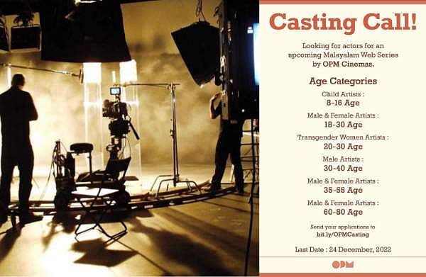 8നും 16 വയസ്സിനും ഇടയില് പ്രായമുള്ള ബാലതാരങ്ങള്. 18നും 30നും ഇടയില് പ്രായക്കാരായ സ്ത്രീകളും പുരുഷന്മാരും, 20നും 30നും ഇടയില് പ്രായമുള്ള ട്രാന്ജെന്ഡര് സ്ത്രീകള്, 30നും 40 വയസ്സിനും ഇടയില് പ്രായമുള്ള പുരുഷന്മാര്, 35-55 പ്രായക്കാരായ സ്ത്രീകളും പുരുഷന്മാരും, 60-80 വയസ്സിനിടയിലുള്ള സ്ത്രീകളും പുരുഷന്മാരും എന്നിവരെയാണ് അഭിനയിക്കാനായി ക്ഷണിച്ചിരിക്കുന്നത്. താത്പര്യമുള്ളവര് ഡിസംബര് 24-ാം തിയതിക്ക് മുമ്പായി http://bit.ly/OPMCasting എന്ന പേജില് വിവരങ്ങള് നല്കണം.