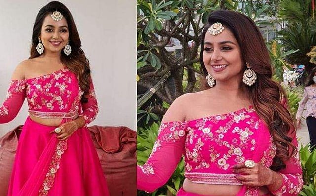 നടി മൃദുല മുരളിയുടെ സംഗീത് രാവിലെ ചിത്രങ്ങളാണ് സോഷ്യൽ മീഡിയയിൽ നിറയുന്നത്. ഡാർക്ക് പിങ്ക് നിറത്തിലെ ഓഫ്ഷോൾഡർ ലെഹങ്കയിൽ അതിസുന്ദരിയാണ് മൃദുല. സ്റ്റേറ്റ്മെന്റ് പീസ് കമ്മലും നെറ്റിച്ചുട്ടിയുമാണ് ആഭരണങ്ങൾ.