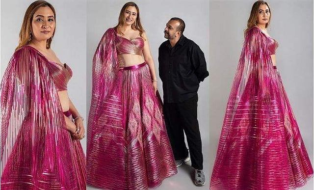 മജന്ത നിറത്തിൽ മെറ്റാലിക് ഹാൻഡ് എബ്രോയിഡറി ലെഹങ്കയാണ് ജ്വാല അണിഞ്ഞത്. ഡിസൈനർ അമിത് അഗർവാളാണ് ജ്വാലയ്ക്ക് വേണ്ടി ഈ ലെഹങ്ക ഒരുക്കിയത്.
