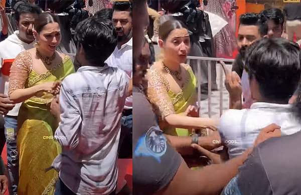 നടിയുടെ അനുവാദമില്ലാെത കയ്യിൽ പിടിച്ച യുവാവിനെ അവിടെയുണ്ടായിരുന്ന ബൗൺസർമാർ പെട്ടന്നു തന്നെ തള്ളി നീക്കി. അതിനിടെ തനിക്ക് ഫോട്ടോ എടുക്കണം എന്ന ആഗ്രഹം ആരാധകൻ പ്രകടിപ്പിച്ചു. ഇതോടെ താരം ആരാധകനൊപ്പം ഫോട്ടോ എടുക്കുകയായിരുന്നു. സോഷ്യൽ മീഡിയയിൽ വൈറലാവുകയാണ് വിഡിയോ. തമന്നയുടെ ആരാധകനോടുള്ള പെരുമാറ്റം വലിയ രീതിയിലാണ് പ്രശംസിക്കപ്പെടുന്നത്. എന്നാൽ യുവാവിനെതിരെ രൂക്ഷ വിമർശനവും ഉയരുന്നുണ്ട്. അനുവാദമില്ലാതെ കയ്യിൽ പിടിക്കുന്നത് തെറ്റാണെന്നും ഒരിക്കലും നടക്കാൻ പാടില്ലാത്തതായിരുന്നു എന്നുമാണ് കമന്റുകൾ.