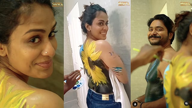 സൂര്യകാന്തിപ്പൂവും തുമ്പിയുമാണ് ചിത്രത്തിലുള്ളത്. വരക്കാനുള്ള ചിത്രം ഡിസൈൻ ചെയ്തതിനു ശേഷം ബോഡി പെയ്ന്റിങ് കലാകാരന്മാർ ഇരുവരുടേയും ദേഹത്ത് ചിത്രം വരയ്ക്കുകയായിരുന്നു. വിഡിയോയിൽ ഒന്നാകെ ടോപ് ലസ്സായാണ് ഹന്ന പ്രത്യക്ഷപ്പെടുന്നത്. പോസ്റ്റർ പോലെ തന്നെ ശ്രദ്ധനേടുകയാണ് അണിയറ വിഡിയോയും.