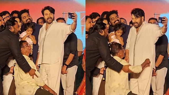 സെല്ഫിയെടുക്കുന്നതിനിടെ നിലത്ത് മുട്ടുകുത്തി നില്ക്കാന് പോയ ഇന്ദ്രന്സിനോട് മമ്മൂട്ടി എഴുന്നേറ്റ് നില്ക്കാന് പറയുന്ന വിഡിയോയും വൈറലായിരുന്നു. മറ്റുള്ളവര്ക്കും ഫ്രെയിമിനുള്ളില് ഇടം കിട്ടാനായി ഇന്ദ്രന്സ് നിലത്തിരിക്കാന് തയ്യാറായത്. സംഭവം വൈറലായതോടെ സോഷ്യല് മീഡിയ രണ്ട് തട്ടിലായിരിക്കുകയാണ്.