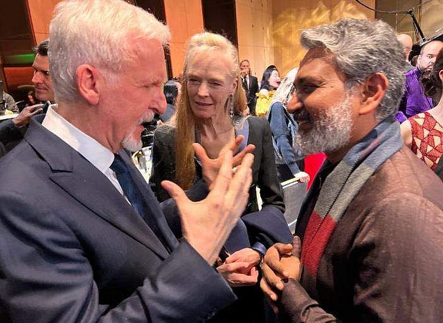 ഗോൾഡൻ ഗ്ലോബ് പുരസ്കാരം നേടിയതോടെ ലോകത്തിന്റെ നെറുകയിൽ എത്തി നിൽക്കുകയാണ് എസ്എസ് രാജമൗലിയുടെ ആർആർആർ. ചിത്രത്തെക്കുറിച്ച് ഇതിനോടകം നിരവധി പേരാണ് കമന്റുമായി എത്തിയത്. ഇപ്പോൾ വിഖ്യാത സംവിധായകൻ ജയിംസ് കാമറൂണുമായുള്ള നിമിഷങ്ങൾ ആരാധകരുമായി പങ്കുവച്ചിരിക്കുകയാണ് രാജമൗലി. ആർആർആർ വളരെ അധികം ഇഷ്ടപ്പെട്ടെന്നും ഭാര്യയ്ക്കൊപ്പം ഇരുന്ന് വീണ്ടും ചിത്രം കണ്ടുവെന്നുമാണ് രാജമൗലി കുറിക്കുന്നത്.