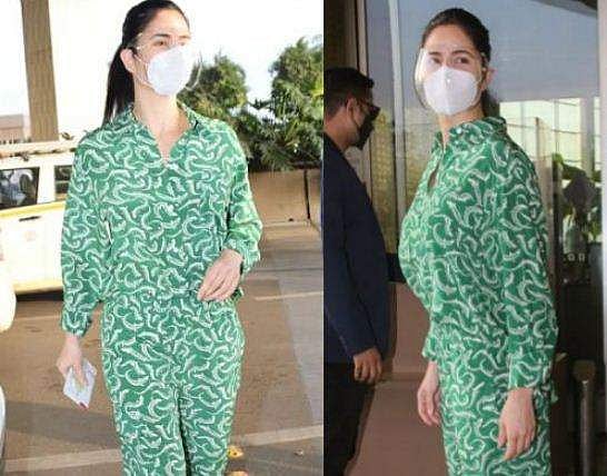 മുംബൈ എയർപോർട്ടിൽ നിന്നുള്ള കത്രീനയുടെ ചിത്രങ്ങളാണ് ശ്രദ്ധനേടുന്നത്. ഗോൾഡ്ഫിഷ് പ്രിന്റ് നിറഞ്ഞ പച്ച പൈജാമയായിരുന്നു വേഷം. വിക്ടോറിയ ബെക്കാമിന്റെ പ്രീ സ്പ്രിങ് സമ്മർ 2022 കളക്ഷനിലെ ഡിസൈൻ ആണിത്. വെള്ള സ്‌നീക്കേഴ്‌സും സ്ലീക്ക് പോണിടെയിലും ആയപ്പോൾ സംഗതി സ്‌റ്റൈലിഷ്.