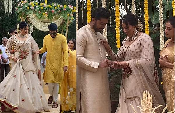 ക്രീം ലെഹങ്കയിൽ അതിസുന്ദരിയായാണ് മാളവികയെ കാണുന്നത്. സഹോദരൻ കാളിദാസാണ് കൈപിടിച്ച് മാളവികയെ വേദിയിലേക്ക് ആനയിച്ചത്. മോതിരം മാറ്റത്തിനിടെ സന്തോഷം കൊണ്ട് മാളവികയുടെ കണ്ണു നിറയുന്നതും വിഡിയോയിൽ കാണാം. ഒരു മാസം മുൻപായിരുന്നു കാളിദാസിന്റെ വിവാഹനിശ്ചയം. കാമുകി താരിണിയെയാണ് കാളിദാസ് വിവാഹം ചെയ്യുന്നത്. കാളിദാസിന്റെ വിവാഹത്തിനു മുമ്പ് മാളവികയുടെ വിവാഹം ഉണ്ടാകുമെന്ന് പാർവതി വെളിപ്പെടുത്തിയിരുന്നു.