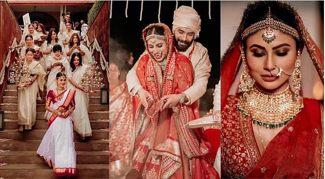 നടി മൗനി റോയിയും സൂരജ് നമ്പ്യാരും കഴിഞ്ഞ ദിവസമാണ് വിവാഹിതരായത്. ദക്ഷിണേന്ത്യൻ–ബാംഗാളി ആചാരങ്ങൾ പ്രകരാമായിരുന്നു വിവാഹങ്ങൾ നടന്നത്. വരൻ സൂരജ് നമ്പ്യാർ മലയാളിയായതിനാലാണ് ദക്ഷിണേന്ത്യൻ ആചാരപ്രകാരം വിവാഹം നടത്തിയത്. വെള്ളയിൽ ചുവന്ന ബോർഡറുള്ള കാഞ്ചീവരം പട്ടുടുത്താണ് മൗനി മലയാളി വധുവായി അണിഞ്ഞൊരുങ്ങിയത്.
