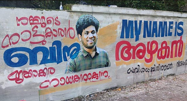 ബിനു തൃക്കാക്കര നായകനാകുന്ന സിനിമ 'മൈ നെയിം ഈസ് അഴകൻ' എന്ന ചിത്രം റിലീസിന് മുന്നോടിയായാണ് നാട്ടുകാരും സുഹൃത്തുക്കളും ചേർന്ന് ചുമരെഴുത്ത് നടത്തിയിരിക്കുന്നത്