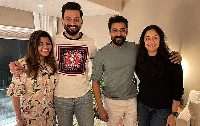 പൃഥ്വിരാജ് തന്നെയാണ് സൂപ്പർതാര ജോഡികൾക്കൊപ്പമുള്ള ചിത്രം പങ്കുവച്ചത്. പ്രചോദനം നൽകുന്ന സുഹൃത്തുക്കൾ എന്ന അടിക്കുറിപ്പിലാണ് പൃഥ്വിരാജ് ഫോട്ടോ പോസ്റ്റ് ചെയ്തത്. വൈകാതെ മറുപടിയുമായി സൂര്യ തന്നെ എത്തി. മനോഹരമായ വൈകുന്നേരമായിരുന്നു. നിങ്ങൾ രണ്ടുപേരും എത്ര മനോഹരമായ ദമ്പതികളാണ്. നമുക്ക് കൂടുതൽ ഓർമകളുണ്ടാക്കാം.- സൂര്യ കുറിച്ചു.