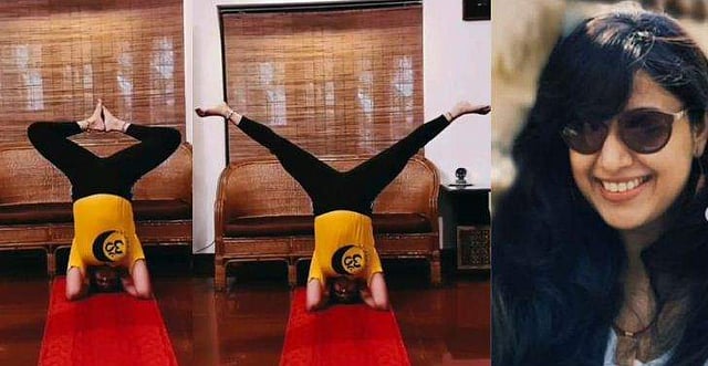 ശീര്‍ഷാസനത്തിൽ നിന്ന് കാലുകൊണ്ട് യോ​ഗാഭ്യാസം ചെയ്യുകയാണ് താരം