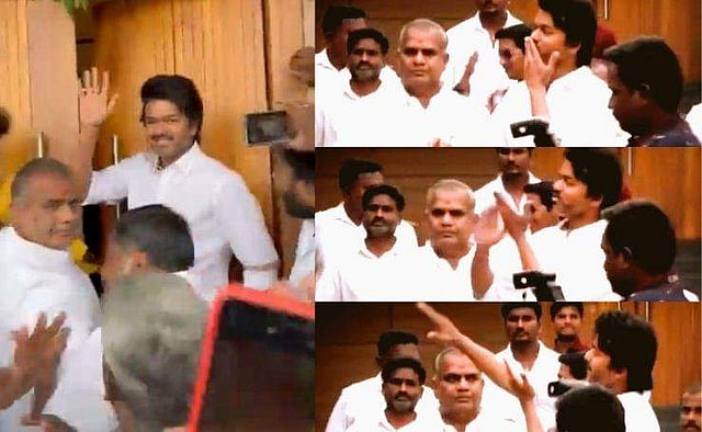 ഇന്നലെ ചെന്നൈയിലെ പനൈയൂരിലെ ഓഫിസിലാണ് ആരാധകരുമായുള്ള കൂടിക്കാഴ്ച നടത്തിയത്. കുടുംബങ്ങളെ നന്നായി നോക്കണമെന്നും വരുമാനത്തിന്റെ ഒന്നോ രണ്ടോ ശതമാനം സമൂഹത്തില് നല്ലതു ചെയ്യാനായി മാറ്റിവെക്കണമെന്നും വിജയ് ആരാധകരോട് പറഞ്ഞു. രജനീകാന്ത് സ്റ്റൈലില് ഫ്ളൈയിങ് കിസ് നല്കിക്കൊണ്ട് എത്തിയ വിജയുടെ വിഡിയോ സോഷ്യല് മീഡിയയില് വൈറലാവുകയാണ്.