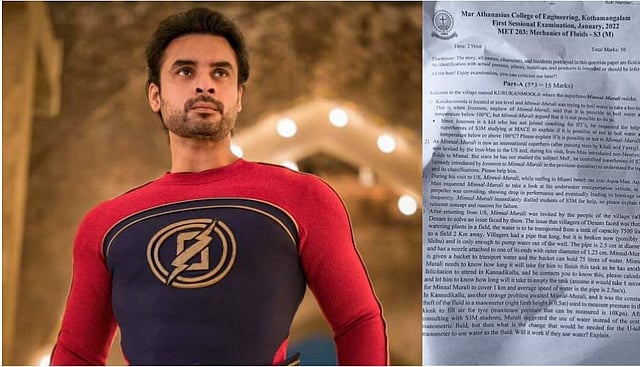 ദേശം , കണ്ണാടിക്കൽ , കുറുക്കൻമൂല എല്ലാം ഉണ്ട്- എന്ന കുറിപ്പിലാണ് ബേസിൽ ചോദ്യപേപ്പർ പങ്കുവച്ചത്. മിന്നൽ മുരളി യുഎസിൽ എത്തി അയൺമാനെയും അക്വാമാനെയും കാണുന്നതും അവരുടെ പ്രശ്നങ്ങൾ മെക്കാനിക്കൽ തിയറി ഉപയോഗിച്ച് പരിഹരിക്കുനന്നതുമാണ് ചോദ്യപേപ്പറിലുള്ളത്. കൂടാതെ കുറുക്കന് മൂലയിലെ കുടിവെള്ള പ്രശ്നം എഞ്ചിനീയറിംഗ് ഉപയോഗിച്ച് പരിഹരിക്കുന്നതിനെക്കുറിച്ചും ചോദ്യമുണ്ട്.