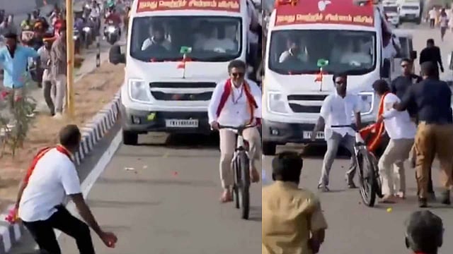 സോഷ്യല് മീഡിയയില് നിറഞ്ഞ് നടനും ടിവികെ അധ്യക്ഷനുമായ വിജയ്. തെരഞ്ഞെടുപ്പ് പ്രചരണത്തിന്റെ ഭാഗമായ നടത്തിയ റാലിയില് നിന്നുള്ള വിഡിയോ സോഷ്യല് മീഡിയയില് വൈറലായി മാറുകയാണ്. പ്രചരണത്തിനിടെ സൈക്കിള് ചവിട്ടി നീങ്ങുകയാണ് വിഡിയോയില് വിജയ്. പിന്നാലെയാണ് അപ്രതീക്ഷിതമായ സംഭവം അരങ്ങേറുന്നത്.