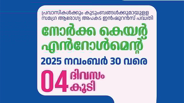 പ്രവാസി കേരളീയര്‍ക്കായി സംസ്ഥാന സര്‍ക്കാര്‍ നോര്‍ക്ക റൂട്ട്സ് വഴി നടപ്പിലാക്കുന്ന സമഗ്ര ആരോഗ്യ അപകട ഇൻഷുറൻസ് പദ്ധതിയായ നോര്‍ക്ക കെയറില്‍ 2025 നവംബര്‍ 30 വരെ എൻറോൾ ചെയ്യാം. സാധുവായ നോര്‍ക്ക പ്രവാസി ഐ.ഡി, സ്റ്റുഡന്റ് ഐ.ഡി. എന്‍.ആര്‍.കെ ഐ.ഡി കാര്‍ഡുളള പ്രവാസികേരളീയര്‍ക്ക് എന്‍റോള്‍ ചെയ്യാവുന്നതാണ്. നോര്‍ക്ക റൂട്ട്സിന്റെ ഔദ്യോഗിക വെബ്സൈറ്റ് സന്ദര്‍ശിച്ചോ നോര്‍ക്ക കെയര്‍ മൊബൈല്‍ ആപ്പുകള്‍ മുഖേനയോ രജിസ്റ്റര്‍ ചെയ്യാം.