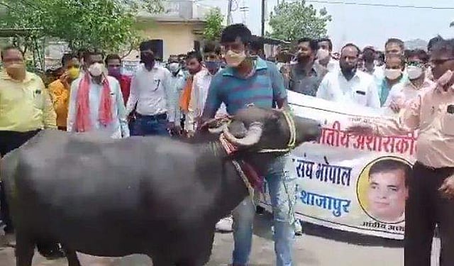 മധ്യപ്രദേശിലെ ഷാജാപൂര്‍ ജില്ലയിലാണ് സംഭവം. കോവിഡ് മഹാമാരിയുടെ സാഹചര്യത്തില്‍ രാജ്യത്തുടനീളമുള്ള സ്‌കൂളുകള്‍ കഴിഞ്ഞ വര്‍ഷം മാര്‍ച്ച് മുതല്‍ അടഞ്ഞുകിടക്കുകയാണ്. ഇതിനെതിരെ നടത്തിയ പ്രതിഷേധത്തിലാണ് പോത്ത് വിരണ്ടത്. തങ്ങളുടെ ആവശ്യങ്ങള്‍ക്ക് കൃത്യമായ പ്രതികരണം ലഭിക്കുന്നില്ലെന്നും പോത്തിന്റെ ചെവിയില്‍ വേദമോതിയിട്ട് കാര്യമില്ലെന്ന് കാണിക്കാനാണ് മൃഗത്തെ പ്രതിഷേധത്തില്‍ പങ്കെടുപ്പിച്ചതെന്നും സ്വകാര്യ സ്‌കൂള്‍ ഉടമകളുടെ പ്രതിനിധി ദിലീപ് ശര്‍മ്മ പറഞ്ഞു.