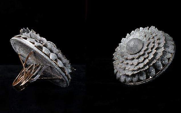 'ദി മാരിഗോള്ഡ്- ഐശ്വര്യത്തിന്റെ മോതിരം' എന്നാണ് ഇതിന് പേരിട്ടിരിക്കുന്നത്. 165 ഗ്രാം മാത്രമാണ് ഇതിന്റെ തൂക്കം. എട്ട് പാളികളിലായാണ് പൂവിന്റെ ആകൃതിയില് മോതിരം ഡിസൈന് ചെയ്തത്. ഇതിലെല്ലാം നിറയെ കുഞ്ഞു കുഞ്ഞു വജ്രങ്ങളാണ് നിറച്ചിരിക്കുന്നത്.