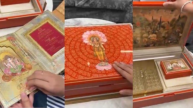 വിവാഹ ക്ഷണക്കത്ത് സൂക്ഷിച്ചിരിക്കുന്ന ഒരു സ്വര്ണ്ണ പുസ്തകമാണ് പെട്ടിക്കുള്ളിലെ മറ്റൊരു പ്രത്യേകത. ഗണപതിയുടെയും രാധാ-കൃഷ്ണന്റെയും ചിത്രങ്ങളാല് പുസ്തകം അലങ്കരിച്ചിരിക്കുന്നു. അവയെല്ലാം ഫ്രെയിമുകളായാണ് ഒരുക്കിയിരിക്കുന്നത്. പശ്ചാത്തലത്തില് മന്ത്രങ്ങള് പ്രതിധ്വനിക്കുന്ന ഒരു വെള്ളി ക്ഷേത്രവും പുരാതന ക്ഷേത്രത്തിന്റെ പ്രധാന കവാടത്തോട് സാമ്യമുള്ള ഒരു വെള്ളി കാര്ഡും ഇതില് കാണാം.
