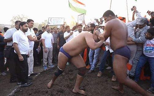 യാത്രയ്ക്കിടയിലാണ് മല്ലൻമാരുടെ ഗുസ്തി കാണാൻ രാഹുൽ എത്തിയത്. കുറച്ച് നേരം ഗുസ്തി കണ്ടശേഷം മല്ലൻമാർക്ക് കൈ കൊടുത്താണ് രാഹുൽ മടങ്ങിയത്.