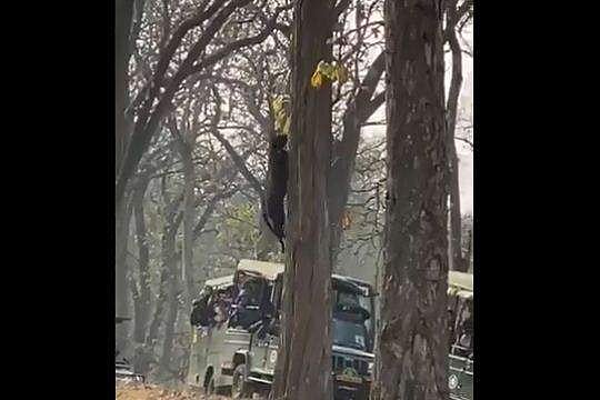കാനനപാതയോട് ചേര്ന്നുള്ള മരത്തിലാണ് കരിമ്പുലി അതിവേഗത്തില് മുകളില് എത്തിയത്. ജംഗിള് സഫാരിക്ക് വന്ന വിനോദ സഞ്ചാരികളെയും വഹിച്ച് കൊണ്ടുള്ള വാഹനം നിര്ത്തിയിട്ടിരിക്കുന്നത് കാണാം. വാഹനത്തില് ഇരിക്കുന്നത് പോലും ഒട്ടും സുരക്ഷിതമല്ല എന്ന സൂചന നല്കുന്നതാണ് കരിമ്പുലിയുടെ അതിവേഗത്തിലുള്ള മരത്തിലേക്കുള്ള പാഞ്ഞുക്കയറ്റം.