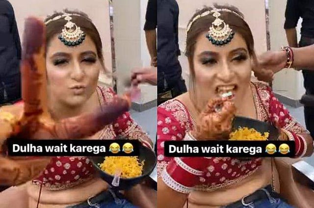 മേക്കപ്പിടുന്നതിനിടയിൽ മാഗി നൂഡിൽസ് കഴിച്ചുകൊണ്ടിരിക്കുന്ന കല്ല്യാണപെണ്ണിനെയാണ് വിഡിയോയിൽ കാണാൻ കഴിയുക. യുവതിയുടെ മേക്കപ്പ് ആർട്ടിസ്റ്റാണ് ഈ വിഡിയോ പങ്കുവച്ചിരിക്കുന്നത്. എന്തുപറ്റി എന്ന് ഇവർ ചോദിക്കുമ്പോൾ വിശന്നിട്ടാണെന്ന് പറഞ്ഞാണ് പെണ്ണ് മാഗി അകത്താക്കുന്നത്. 'ചെക്കൻ കാത്തുനിന്നോളും' എന്നു പറയുന്നതും കേൾക്കാം.