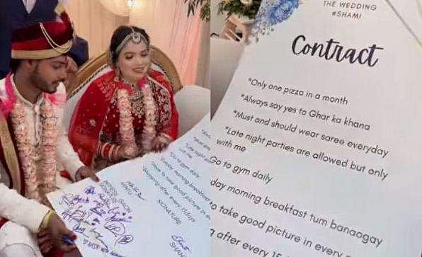 വിവാഹ ഉടമ്പടിയിൽ ഒപ്പുവയ്ക്കുന്ന വധൂവരന്മാരുടെ ഒരു വീഡിയോയാണ് ശ്രദ്ധ നേടുന്നത്. അസമിലെ ഗുവാഹത്തി സ്വദേശികളായ ഈ വധൂവരന്മാർ ഉടമ്പടിയിൽ എട്ട് നിബന്ധനകൾ കൂട്ടിച്ചേർത്തു. ആ നിബന്ധനകളാണ് സാമൂഹിക മാധ്യമങ്ങളിൽ ചിരി പടർത്തുന്നത്.