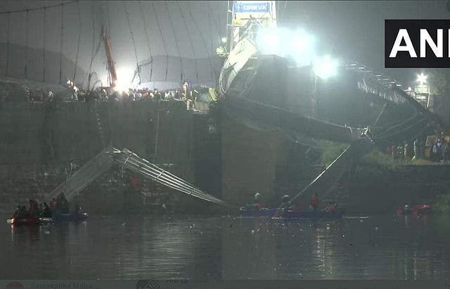 മോര്ബിയിലെ മച്ചു നദിയ്ക്ക് കുറുകെയുള്ള പാലമാണ് വൈകീട്ട് 6.30ഓടെ തകര്ന്നത്. അപകടം ഉണ്ടാകുന്ന സമത്ത് അഞ്ഞൂറിലേറെ പേര് പാലത്തിലുണ്ടായിരുന്നു. പുതുക്കി പണിതശേഷം അഞ്ച് ദിവസം മുമ്പ് തുറന്നുകൊടുത്ത പാലമാണ് തകര്ന്നുവീണത്. പാലം തകര്ന്ന് നൂറിലേറെ പേര് പുഴയില് വീണെന്നാണ് വിവരം.