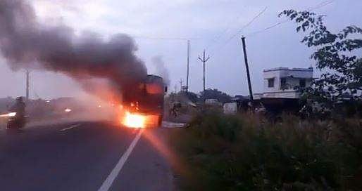 ബസിന് തീപിടിച്ചപ്പോള്‍ വാഹനത്തിന്റെ അടിയില്‍ കുടുങ്ങിയ ഒരു ബൈക്ക് യാത്രക്കാരന്റെ ദേഹത്തേയ്ക്ക് തീ ആളിപ്പടര്‍ന്നു. ബസിന് തീപിടിച്ചതോടെ, പൊലീസ് ഉദ്യോഗസ്ഥര്‍ ബസില്‍ നിന്നിറങ്ങി രക്ഷപ്പെടുന്ന ദൃശ്യങ്ങള്‍ പുറത്തുവന്നിട്ടുണ്ട്. പ്രമുഖ രാഷ്ട്രീയ നേതാവ് ജയ്പ്രകാശ് നാരായണന്റെ 120-ാം ജന്മദിനാഘോഷത്തില്‍ പങ്കെടുത്ത് പൊലീസ് ഉദ്യോഗസ്ഥര്‍ മടങ്ങുന്നതിനിടെയാണ് അപകടം നടന്നത്.