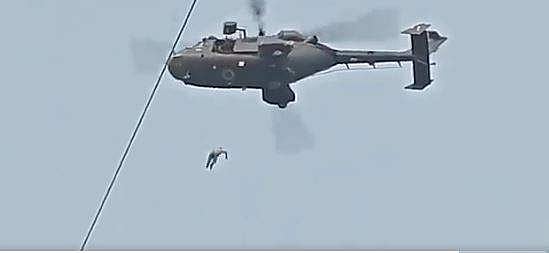 എയര് ലിഫ്റ്റ് ചെയ്യുന്നതിനിടെ, ആള് താഴേക്ക് പതിക്കുന്നതിന്റെ ഞെട്ടിക്കുന്ന വീഡിയോ സാമൂഹ്യ മാധ്യമങ്ങളിലൂടെ പുറത്തുവന്നു. രക്ഷപ്പെടുത്താന് ശ്രമിക്കുന്നതിനിടെ, വ്യോമസേനയുടെ ഹെലികോപ്റ്റര് റോപ്പില് നിന്ന് പിടിവിട്ടതതാണ് അപകടത്തിന് കാരണമായത്. റോപ്പില് തൂങ്ങിക്കിടന്ന ഇദ്ദേഹത്തിന്, കോപ്റ്ററിന്റെ ചിറകിന്റെ ശക്തമായ കാറ്റില് പിടിച്ചു നില്ക്കാന് സാധിച്ചില്ല. രക്ഷാപ്രവര്ത്തകര് ഇദ്ദേഹത്തെ പിടിച്ചു കയറ്റാന് ശ്രമിക്കുന്നതും വീഡിയോയില് കാണാം.