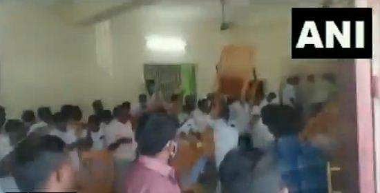 നേതാക്കളുടെ തലയ്ക്ക് മുകളിലൂടെ കസേരകള് പറക്കുന്നത് വീഡിയോയില് കാണാം. കസേരകള് വരുന്നത് കണ്ട് ഓടി മാറുന്ന പ്രവര്ത്തകരെയും വീഡിയോയില് കാണാം.