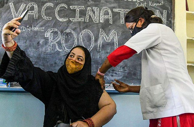 കോവിഡ് വാക്‌സിനേഷനിടെ സെല്‍ഫി എടുക്കുന്ന യുവതി