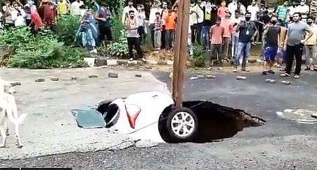 കനത്തമഴയില്‍ റോഡില്‍ അഗാധ ഗര്‍ത്തം, ഓടുന്ന കാര്‍ കുഴിയിലേക്ക്, പൊലീസുകാരന്‍ അത്ഭുതകരമായി രക്ഷപ്പെട്ടു - വീഡിയോ