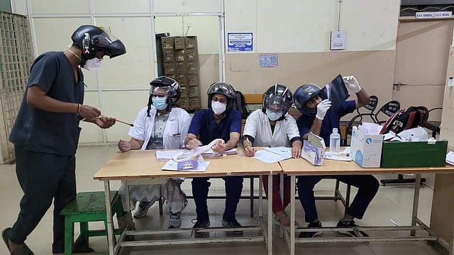 ഹൈദരബാദ്: ഹെല്മെറ്റ് ധരിച്ച് അസാധാരണ പ്രതിഷേധവുമായി ജൂനിയര് ഡോക്ടര്മാര്. ഹൈദരബാദിലെ ഉസ്മാനിയ ജനറല് ആശുപത്രിയിലെ ഡോക്ടര്മാരാണ് വേറിട്ട പ്രതിഷേധം സംഘടിപ്പിച്ചത്. തിങ്കളാഴ്ച ത്വക്ക് രോഗവിഭാഗത്തിലെ ഡ്യൂട്ടി ഡോക്ടറുടെ മേല് സീലിങ് ഫാന് വീണ് തലയ്ക്ക് പരിക്കേറ്റതിനെ തുടര്ന്നായിരുന്നു പ്രതിഷേധം.