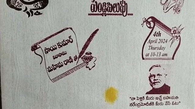 ഹൈദരാബാദ്: മകന്റെ വിവാഹ ക്ഷണക്കത്തില് ലോക്സഭാ തെരഞ്ഞെടുപ്പില് മോദിക്ക് വോട്ട് ചെയ്യാന് അഭ്യര്ഥിച്ച് തെലങ്കാന സ്വദേശി. അതിഥികള് വിവാഹ സമ്മാനം ഒന്നും കൊണ്ടുവരേണ്ടെന്നും മോദിക്കു നല്കുന്ന വോട്ടാണ് ഏറ്റവും നല്ല വിവാഹസമ്മാനമെന്നുമാണു നന്ദികാന്തി നര്സിംലു വിവാഹക്ഷണക്കത്തില് അച്ചടിച്ചിരിക്കുന്നത്. മോദിയുടെ ചിത്രവും കത്തിലുണ്ട്.