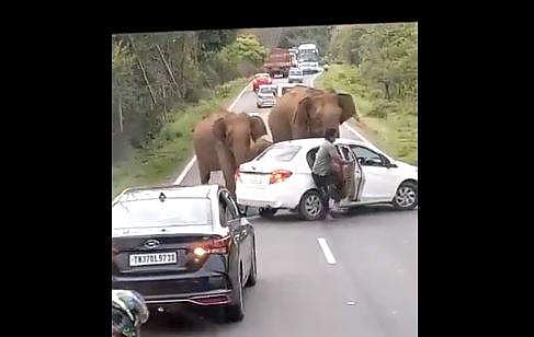 ആനക്കൂട്ടത്തെ കണ്ട് വാഹനങ്ങള് നിര്ത്തുന്നത് വീഡിയോയില് വ്യക്തമാണ്. എന്നാല് നടുറോഡില് നിര്ത്തിയിട്ടിരിക്കുന്ന കാറിന്റെ അരികിലേക്ക് ആനക്കൂട്ടം കുതിച്ചെത്തുന്നതാണ് വീഡിയോയുടെ ഉള്ളടക്കം.