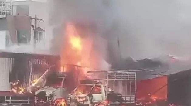 വൈകുന്നേരം 4.30ഓടെയാണ് അപകടമുണ്ടായത്. തീയണക്കാനുള്ള ശ്രമം തുടരുകയാണ്. പടക്ക കടയില് ലോഡ് ഇറക്കുന്നതിനിടെയാണ് അപകടമുണ്ടായത്. റോഡരികില് നിര്ത്തിയിട്ടിരുന്ന നിരവധി വാഹനങ്ങളും കത്തി നശിച്ചു.