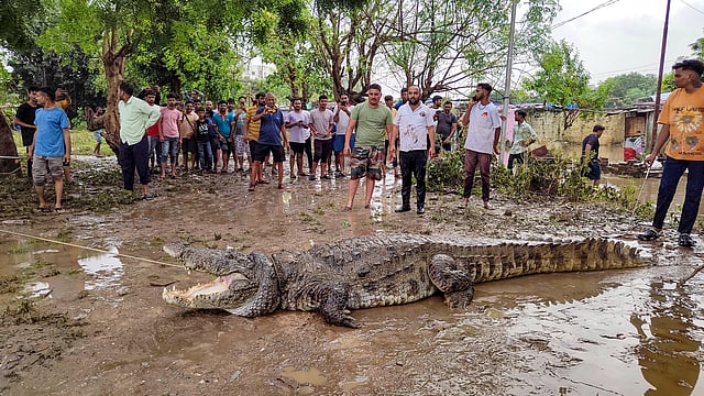 ന്യൂഡല്ഹി: ഗുജറാത്തില് കനത്ത മഴയെത്തുടര്ന്നുണ്ടായ വെള്ളപ്പൊക്കത്തില് വഡോദരയില് മുതല കൂട്ടങ്ങള് എത്തിയത് ജനങ്ങളുടെ ജീവന് ഭീഷണിയാകുന്നു. വാര്ത്താ ഏജന്സിയായ പിടിഐ പങ്കിട്ട വിഡിയോയില് നഗരത്തിലെ അകോട്ട സ്റ്റേഡിയം പ്രദേശത്ത് ഒരു വീടിന്റെ മേല്ക്കൂരയില് മുതലയെ കാണാം. മുതലയെ കണ്ടതോടെ നാട്ടുകാര് പരിഭ്രാന്തരായെന്നാണ് റിപ്പോര്ട്ടുകള്.