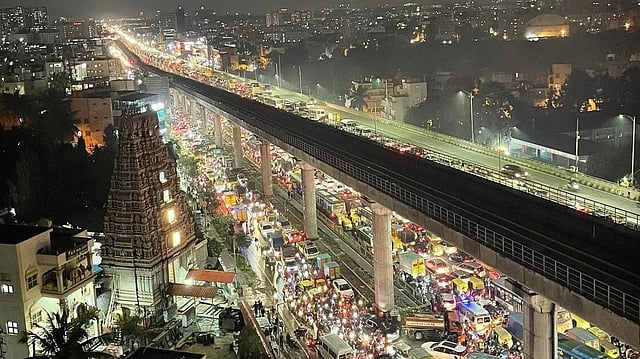 'ഇലക്ട്രോണിക്സിറ്റി ഫ്ളൈഓവറില് ഗതാഗതം ഒന്നര മണിക്കൂറിലേറെയായി പൂര്ണ്ണമായും സ്തംഭിച്ചു. ഞാന് ഇപ്പോള് 30 കിലോമീറ്റര് അകലെയുള്ള എന്റെ വീട്ടില് എത്തേണ്ട സമയം കഴിഞ്ഞു. വിവിധ കമ്പനികളിലെ ഭൂരിഭാഗം ജീവനക്കാരും നിരാശരായി നടക്കാന് തുടങ്ങുന്നത് നമുക്ക് കാണാം' മഡിവാള ട്രാഫിക് പൊലീസിനെ ടാഗ് ചെയ്തുകൊണ്ട് ഓരാള് എക്സില് കുറിച്ചു. കനത്ത മഴയെത്തുടര്ന്ന് ബൊമ്മനഹള്ളിയില് നിന്ന് ഇലക്ട്രോണിക് സിറ്റിയിലേക്ക് വാഹനങ്ങള് നിയന്ത്രിച്ചതോടെ രണ്ട് മണിക്കൂറിലേറെ ഗതാഗതം സ്തംഭിച്ചതായി മറ്റൊരു ഉപയോക്താവ് കുറിച്ചു.