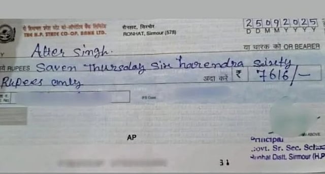 ഷിംല: ഹിമാചല് പ്രദേശിലെ രോണ്ഹട്ടിലെ ഒരു സര്ക്കാര് സ്കൂളിന്റെ പ്രിന്സിപ്പല് എഴുതിയ ചെക്കിന്റെ ചിത്രം സാമൂഹിക മാധ്യമങ്ങളില് വൈറല്. ചെക്കിലെ തുക കൃത്യമായി അക്കത്തില് എഴുതിയിട്ടുണ്ടെങ്കിലും, ഇംഗ്ലിഷില് എഴുതിയപ്പോള് മൊത്തം തെറ്റി. 7,616 എന്നത് സെവന് തൗസന്ഡ് സിക്സ് ഹന്ഡ്രഡ് ആന്ഡ് സിക്സ്റ്റീന്' എന്നെഴുതേണ്ടതിന് പകരം 'Saven Thursday six Harendra sixty rupees only' എന്നാണ് എഴുതിയത്.