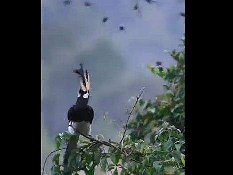 തൊട്ടടുത്തുകൂടി പറന്നു പോകുന്ന ചെറിയ വവ്വാലുകളെയാണ് സ്വതസിദ്ധമായ രീതിയിൽ വേഴാമ്പൽ നീണ്ട കൊക്കിനുള്ളിലൊതുക്കിയത്. ദൃശ്യം പകർത്തിയത് എവിടെ നിന്നാണെന്ന് വ്യക്തമല്ല. ഓറിയന്റൽ പൈഡ് വിഭാഗത്തിൽ പെട്ട വേഴാമ്പലാണിത്.