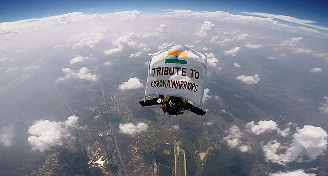 ന്യൂഡല്ഹി: കോവിഡിനെതിരെപോരാട്ടം നയിക്കുന്ന മുന്നിര പോരാളികള്ക്ക് ആദരം അര്പ്പിച്ച് ഇന്ത്യന് വ്യോമസേന. മുന്നിര പോരാളികള്ക്ക് ആദരം എന്ന് എഴുതിയ ബാനറുമായി വ്യോമസേന ഉദ്യോഗസ്ഥന് സ്കൈ ഡൈവിങ് നടത്തിയാണ് ഐക്യദാര്ഢ്യം പ്രഖ്യാപിച്ചത്.