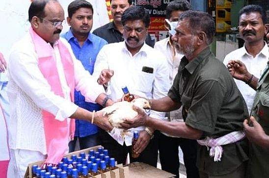 200 കുപ്പി മദ്യവും 200 കോഴികളേയുമാണ് വിതരണത്തിനായി എത്തിച്ചത്. തെലങ്കാന മുഖ്യമന്ത്രി കെ ചന്ദ്രശേഖര റാവു, വ്യവസായ മന്ത്രി കെ ടി രാമ റാവു എന്നിവരുടെ കട്ടൗട്ടുകള്‍ സ്ഥാപിച്ചായിരുന്ന മദ്യ വിതരണം.