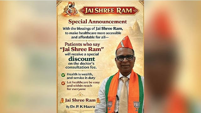 കൊൽക്കത്ത: 'ജയ് ശ്രീറാം' വിളിക്കുന്ന രോഗികൾക്ക് ചികിത്സ ഫീസിൽ ഇളവ് പ്രഖ്യാപിച്ച് ഡോക്ടർ. കൊൽക്കത്തയിലെ ഹൃദ്രോഗ വിദഗ്ധൻ ആയ ഡോ. പി കെ ഹസ്രയാണ് വിവാദ പ്രഖ്യാപനവുമായി രംഗത്ത് എത്തിയത്. ജയ് ശ്രീറാം വിളിച്ചാൽ കൺസൾട്ടേഷൻ ഫീസിൽ 500 രൂപ ഇളവ് നൽകുമെന്ന പോസ്റ്റർ ഇയാളുടെ ക്ലിനിക്കിന് സമീപം പ്രദർശിപ്പിക്കുകയും ചെയ്തിട്ടുണ്ട്. ഈ പോസ്റ്ററിൽ ബിജെപി സ്കാർഫ് ധരിച്ച ഹസ്രയുടെ ചിത്രവുമുണ്ട്.