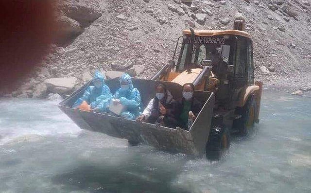 ലഡാക്കില് നിന്ന് അത്തരത്തില് ഒരു വാര്ത്തയാണ് പുറത്തുവന്നത്. പ്രകൃതി ക്ഷോഭത്തെ തുടര്ന്ന് ആരോഗ്യപ്രവര്ത്തകര് നദി മുറിച്ച് കടക്കാന് ജെസിബി ഉപയോഗിക്കുന്ന ദൃശ്യങ്ങളാണ് അത്. മറ്റ് മാര്ഗങ്ങളൊന്നുമില്ലാതെ വന്നപ്പോഴാണ് ഇവര്ക്ക് ജെസിബിയെ ആശ്രയിക്കേണ്ടി വന്നത്