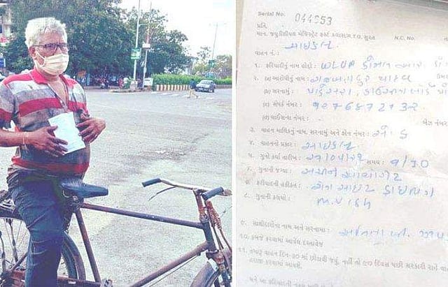 48 കാരനായ രാജ്ബഹാദൂര് യാദവ് ജോലിക്ക് പോകുമ്പോഴായിരുന്നു സംഭവം. നിയമം ലംഘനം നടത്തിയെന്ന് പറഞ്ഞ് പൊലീസ് ഇയാളെ തടഞ്ഞുനിര്ത്തി. തുടക്കത്തില് മോട്ടോര് വാഹനനിയമമനുസരിച്ചാണ് പിഴ ചുമത്തിയത്. പിന്നീട് ഇത് തിരുത്തി ഗുജറാത്ത് പൊലീസ് അക്ട് അനുസരിച്ച് കേസ് എടുത്ത് പിഴത്തുക കോടതിയില് അടയ്ക്കാന് നിര്ദ്ദേശിക്കുകയായിരുന്നു.