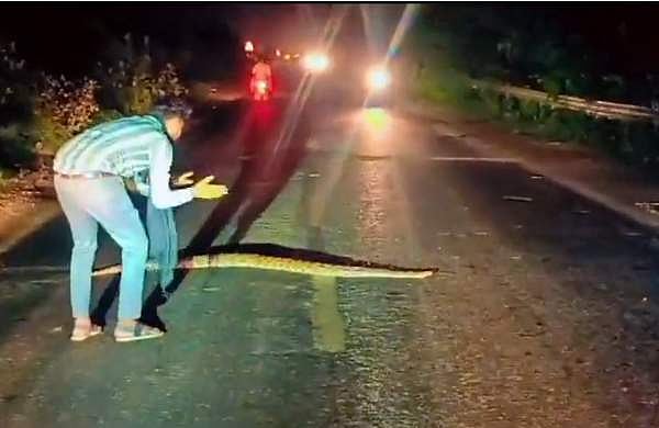 വാഹനങ്ങള് തടഞ്ഞുനിര്ത്തിയ ശേഷമാണ് യുവാവ് കൈയടിച്ച് ഒച്ചയുണ്ടാക്കി പെരുമ്പാമ്പിന് പോകാന് വഴിയുണ്ടാക്കാന് ശ്രമിച്ചത്. ചിലര് ഇതൊന്നും വകവെയ്ക്കാതെ പെരുമ്പാമ്പിന്റെ അരികിലൂടെ വാഹനം ഓടിച്ചുപോകുന്നതും വീഡിയോയില് വ്യക്തമാണ്.