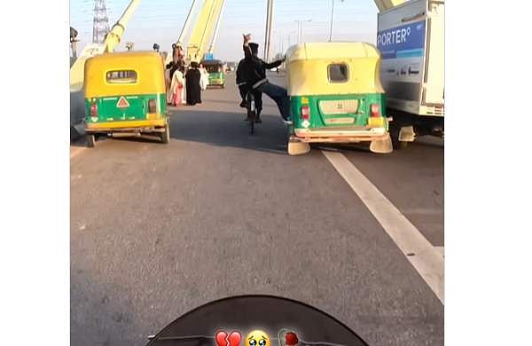 ഡല്ഹി സിഗ്നേച്ചര് പാലത്തിലാണ് സംഭവം.അതിവേഗത്തില് പായുകയാണ് ഓട്ടോറിക്ഷ. ഓട്ടോറിക്ഷയുടെ കമ്പിയില് പിടിച്ച് വാഹനത്തിന്റെ പുറത്ത് നിന്ന് അഭ്യാസപ്രകടനം നടത്തുകയാണ് യുവാവ്. യുവാവിന്റെ അഭ്യാസപ്രകടനം തൊട്ടുപിന്നില് ബൈക്കില് വരുന്ന കൂട്ടുകാര് ക്യാമറയില് പകര്ത്തുന്നതും വീഡിയോയില് കാണാം.