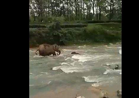 നദി മുറിച്ചു കടക്കാനെത്തിയ ആനക്കൂട്ടത്തിനൊപ്പമുണ്ടായിരുന്ന ആനക്കുട്ടിയാണ് കുത്തൊഴുക്കില്പ്പെട്ടത്. ഒഴുക്കില്പ്പെട്ട ആനക്കുട്ടിയുടെ പിന്നാലെ ഓടിയെത്തി രക്ഷിക്കുകയായിരുന്നു അമ്മയാന. മറ്റ് ആനകളെല്ലാം നദികടന്ന് മറുകരയിലെത്തിയിരുന്നു.