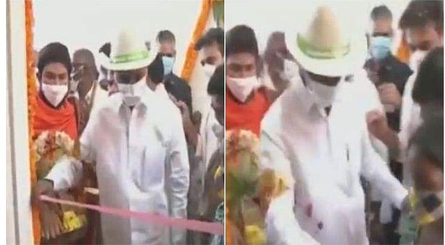 മേഡിപ്പള്ളിയില് വീട് കൈമാറുന്ന ചടങ്ങിനിടെയാണ് സംഭവം. കത്രികക്കായി കാത്തുനിന്നെങ്കിലും കൊണ്ടുവരാന് വൈകി. ഇതോടെ ക്ഷമകെട്ട മുഖ്യമന്ത്രി നാട തട്ടിമാറ്റി അകത്തുകയറുകയായിരുന്നു. പിന്നീട് പൂജകള്ക്ക് ശേഷം വീട് കൈമാറി.